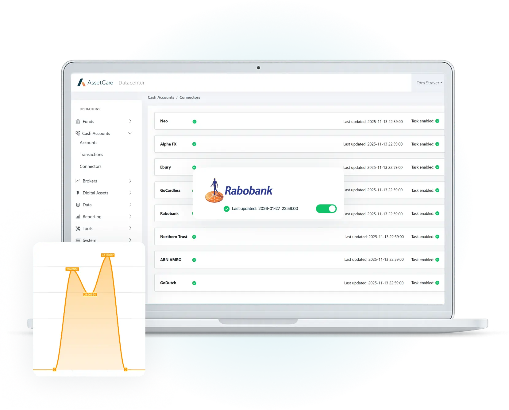 AssetCare biedt de expertise én het platform voor elk type fonds. Voor liquide fondsen, zoals beursgenoteerde beleggingen en crypto, koppelt AssetCare met alle toonaangevende brokers, banken, exchanges en on-chain protocollen, zodat transacties en balansen automatisch worden opgehaald, gevalideerd en verwerkt.